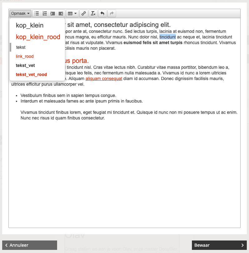 Om tekst te bewerken klik je op het gewenste tekstkader. Je komt dan in de teksteditor van Docufiller terecht. Naast de editor mogelijkheden zijn er ook voorgedefinieerde opmaakstijlen. Deze sluiten perfect aan op de huisstijl van jouw organisatie.
